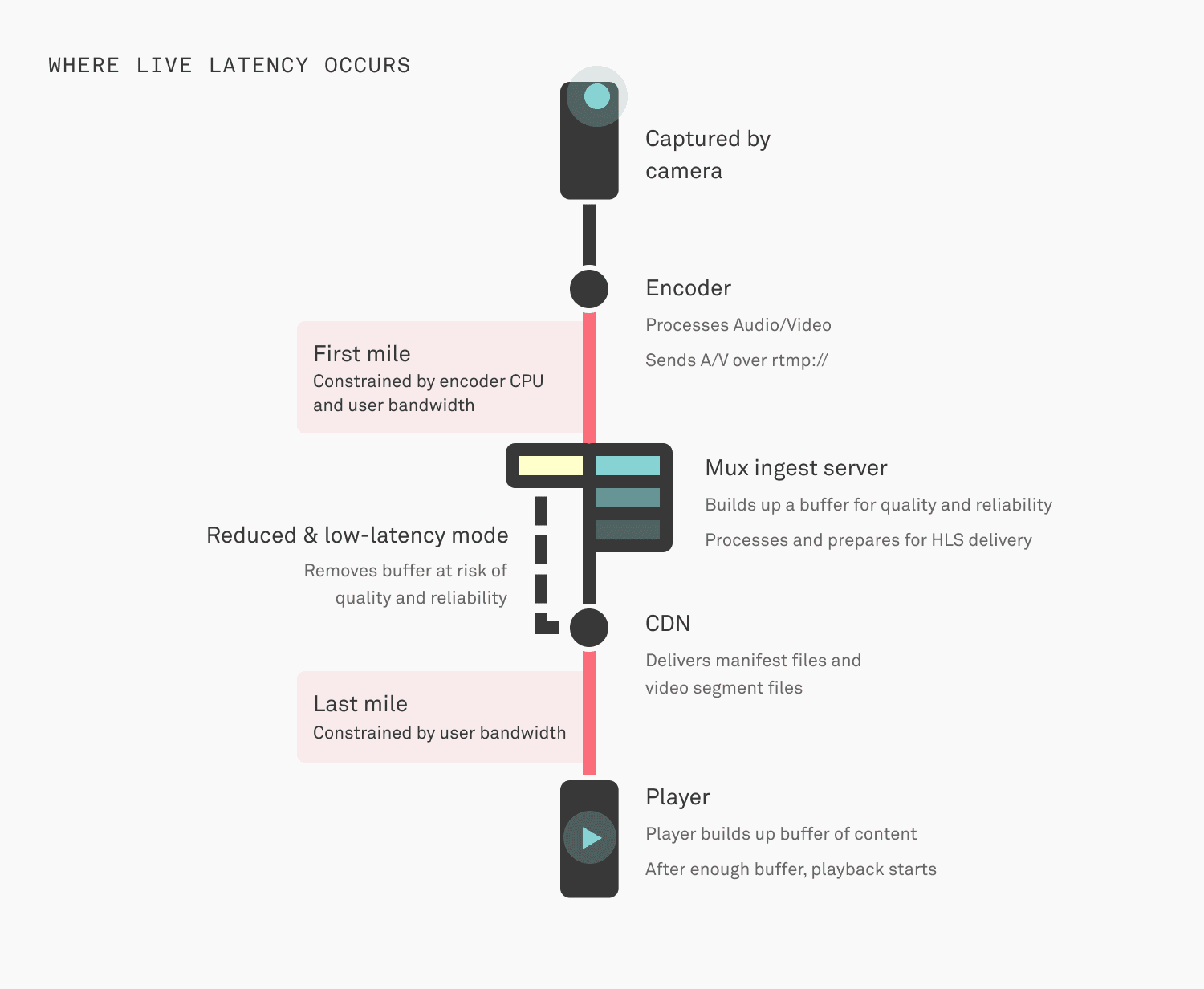 As shown in the image above, there is latency added at every step. However, Mux does not control any latency added during video capture on the camera, encoder processing delays, and amount of video buffered & the decoding time of the video player.