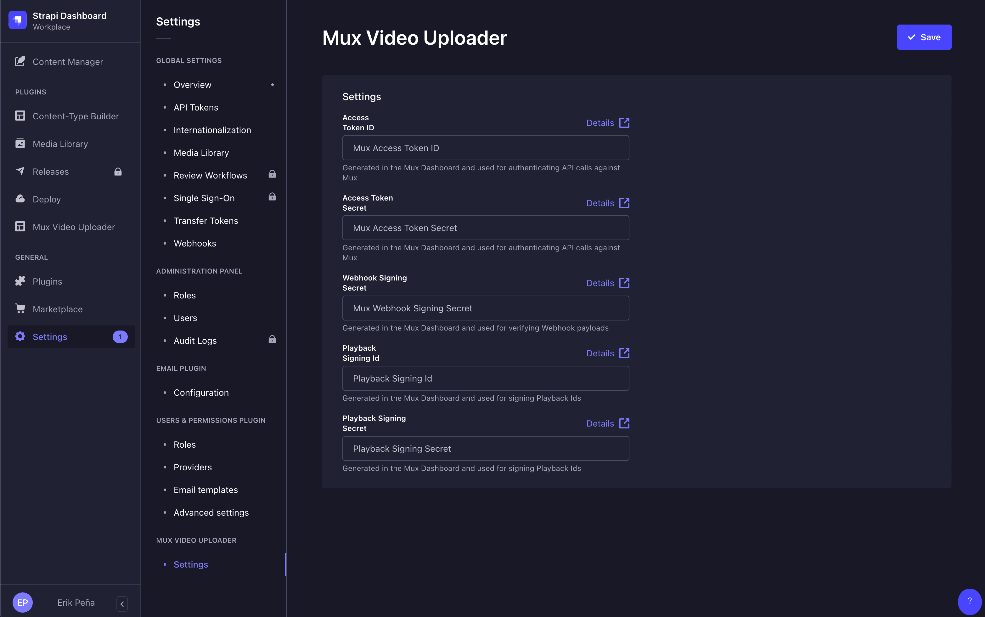 In Strapi, visit the Settings page and navigate to the MUX VIDEO UPLOADER section.